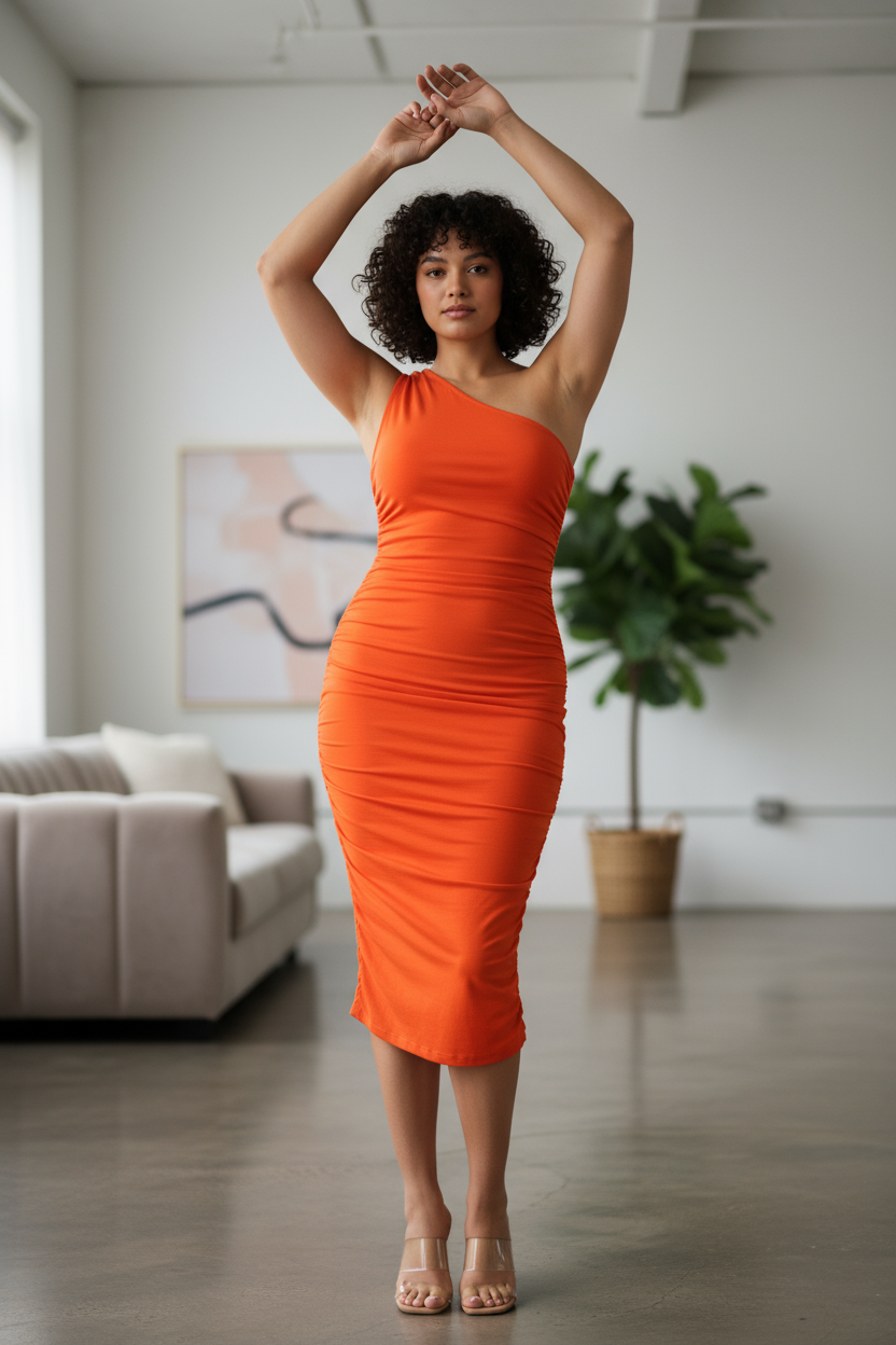 Step into the spotlight and let the Poinciana Ruched One-Shoulder Dress be your statement piece, embodying empowerment and style for the woman who recognizes her worth. Elevate your wardrobe today.