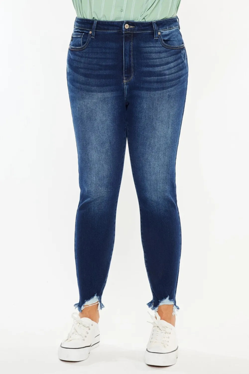 Elevate your wardrobe with Kendra's Trendy Distressed Ankle High Rise Jeans from Kancan. These jeans blend style and comfort effortlessly, featuring a flattering high-rise fit that sits perfectly at your waist.