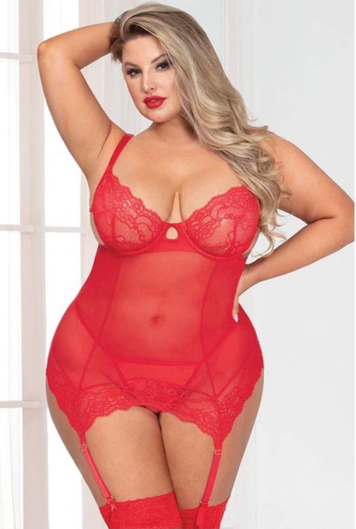 Eyelash lace and mesh merry widow with underwire, picot trim, angled lace hem, hook and eye back closure, back ribbon lace-up detail