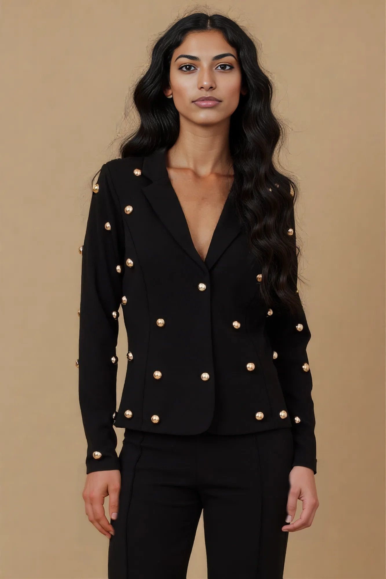 Introducing Juliette's Noir Studded Fashion Statement Jacket, a masterpiece where allure effortlessly intertwines with timeless beauty. This exquisite jacket is designed for the discerning individual who seeks to make a bold statement. Its intricate studded detailing adds a touch of sophistication, elevating any outfit to new heights.