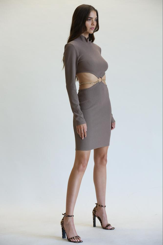 With a sophisticated high neck and long sleeves, the dress radiates refinement, while the daring cutout waist, accentuated by an adjustable gold chain, adds a bold touch to your wardrobe. The zipper back closure guarantees a flawless fit, effortlessly transforming your look from day to night.