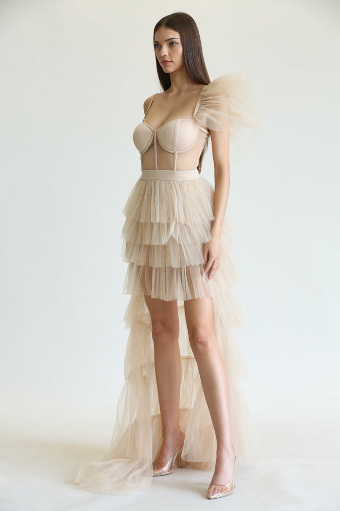 Crafted from delicate tulle mesh, the dress features a captivating one-shoulder design that embraces your beauty. The adjustable shoulder straps ensure a perfect fit, providing comfort without compromising style. A sheer corset waist with boning beautifully accentuates your silhouette, offering a flattering and refined appearance.