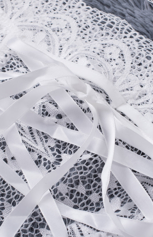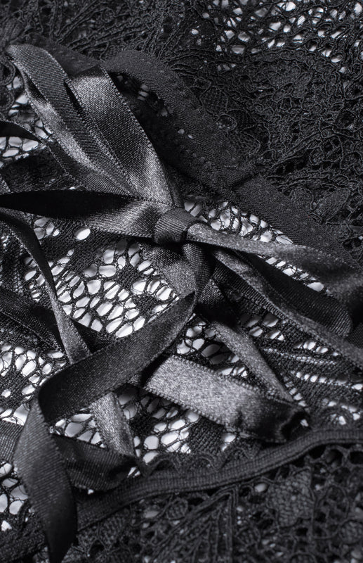 - High-waisted lace panties adorned with whimsical crisscross details and a charming bow applique, adding a playful touch