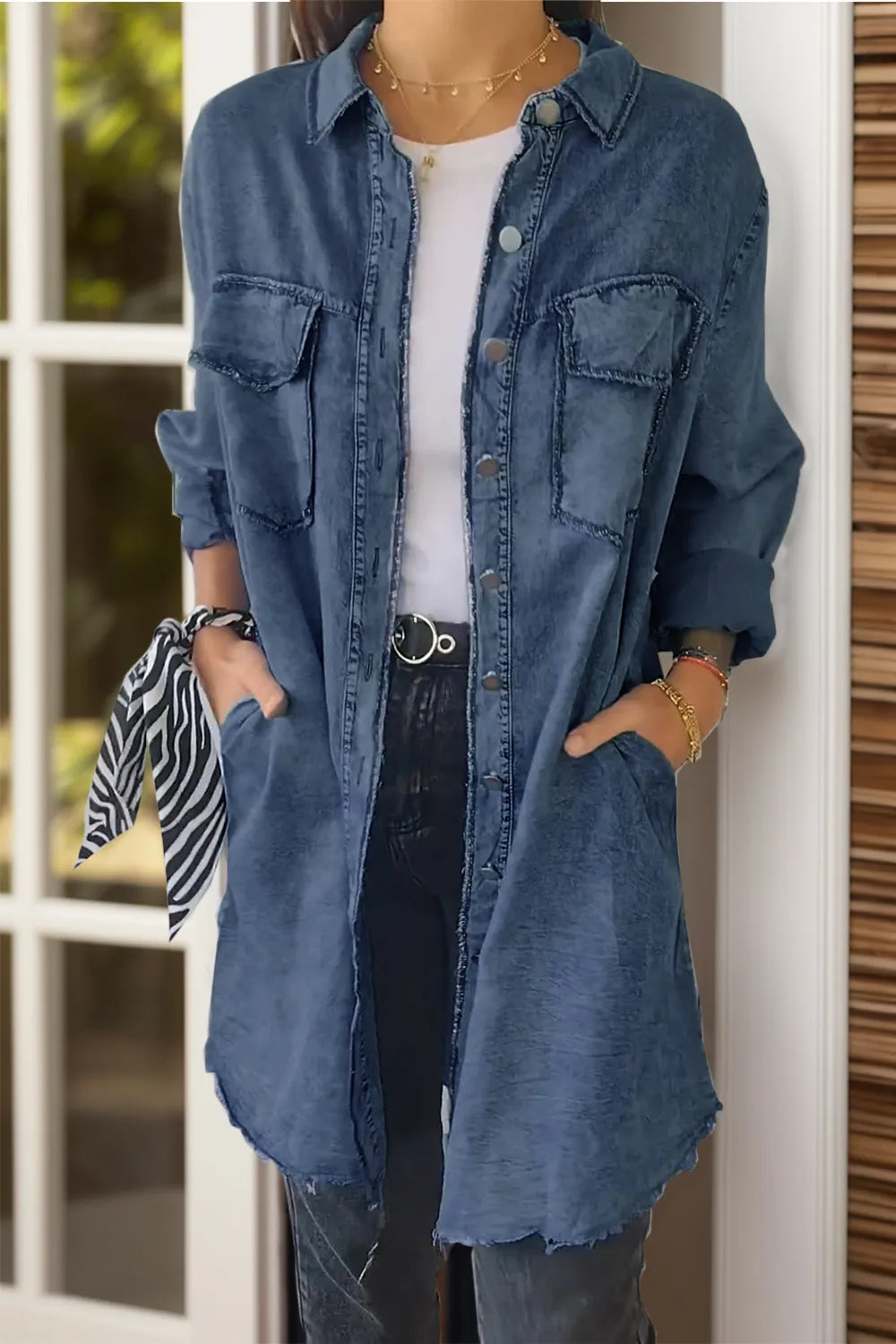 Discover the elegance of Lila's Curves: Tailored Button-Up Denim Jacket, a must-have addition to your wardrobe. This impeccably crafted jacket boasts a classic buttoned design combined with functional pockets, making it both stylish and practical.