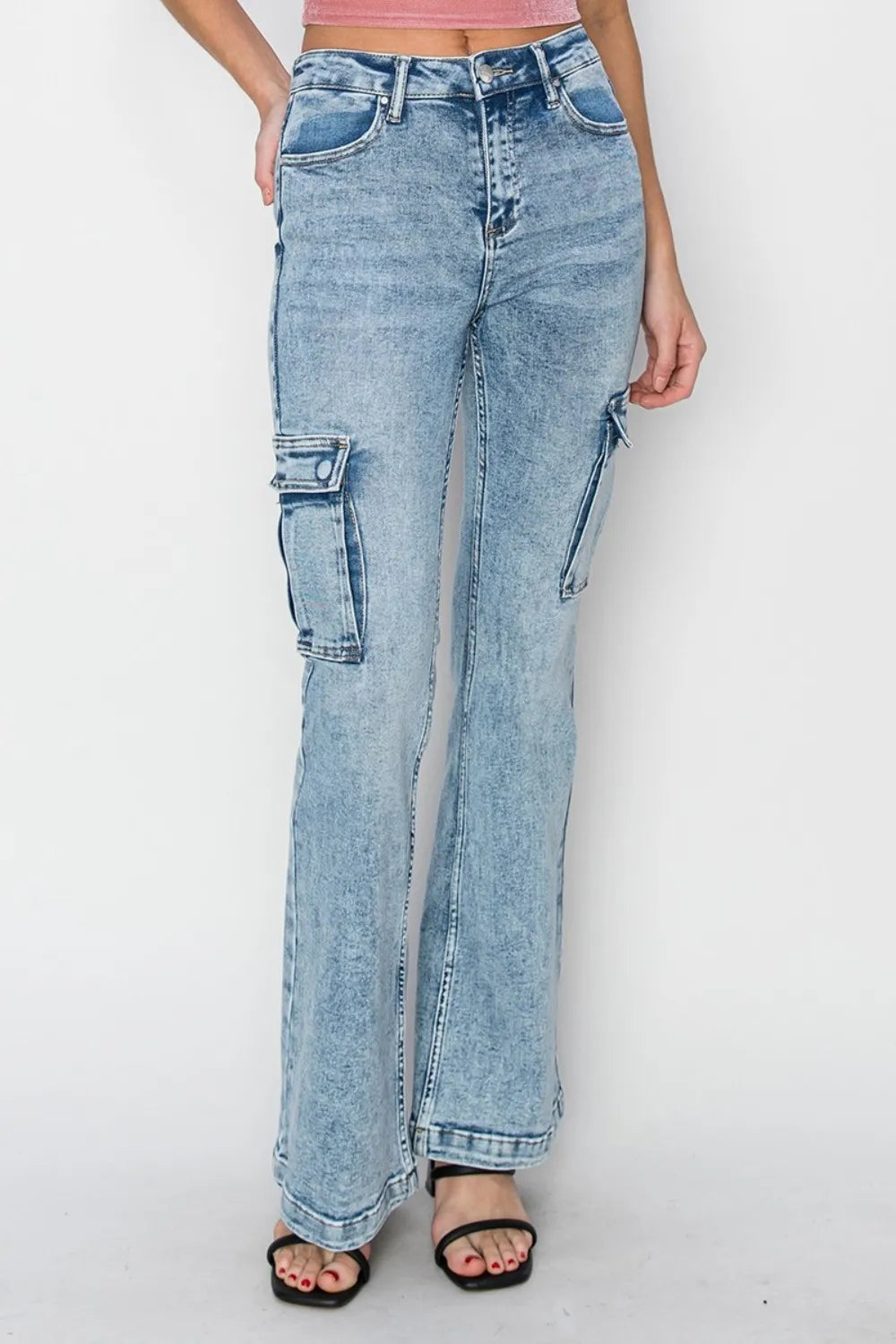 Discover the perfect blend of utility and style with Hazel's Vintage-Inspired High-Waisted Cargo Flare Jeans. Designed to flatter your figure, these jeans showcase a fashionable high-waisted silhouette paired with a trendy flared leg that evokes a retro charm.