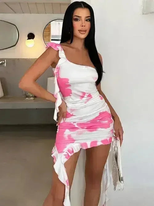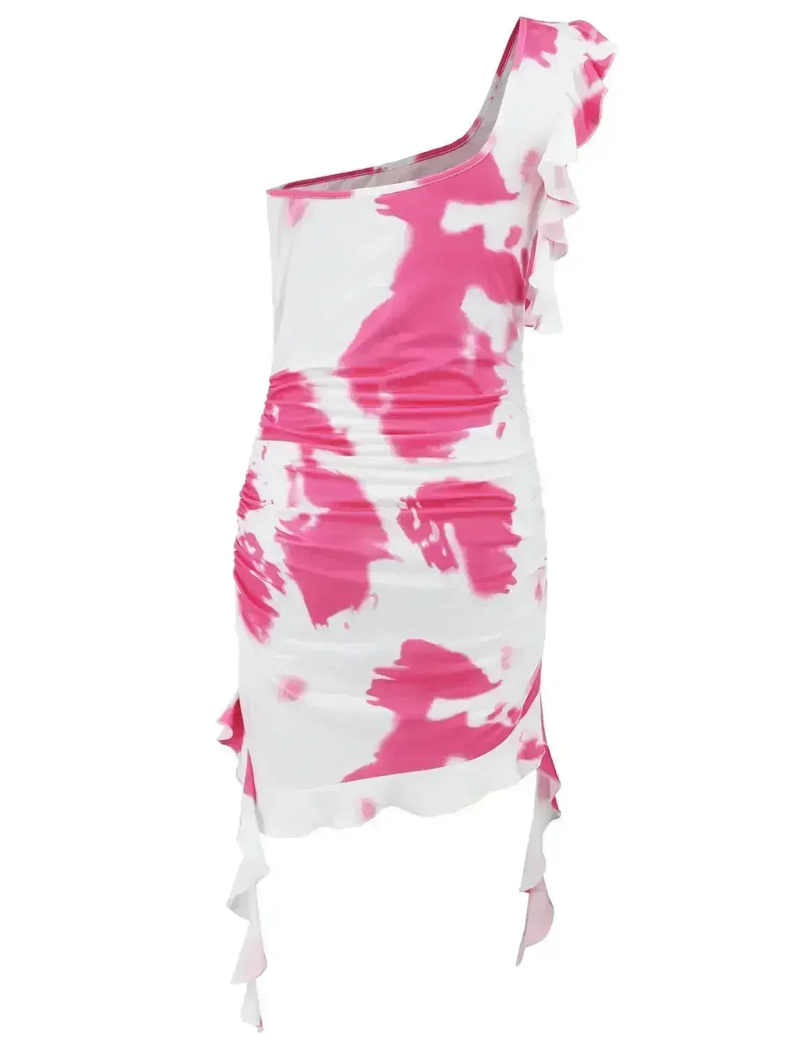 Ruffled Tie-Dye Single Shoulder Mini Dress