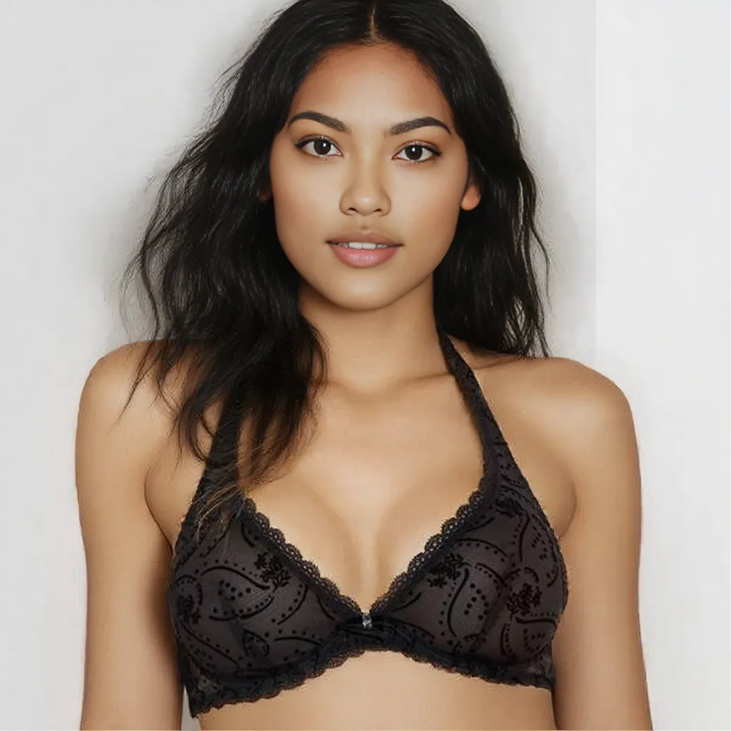 Introducing Delilah's Midnight Lace Desire Bra by Antigel By Lise Charmel Lingerie, where the allure of romance intertwines with exquisite elegance. This breathtaking triangle bra features a sheer lace design that captivates with its modern sophistication and ignites an irresistible passion.