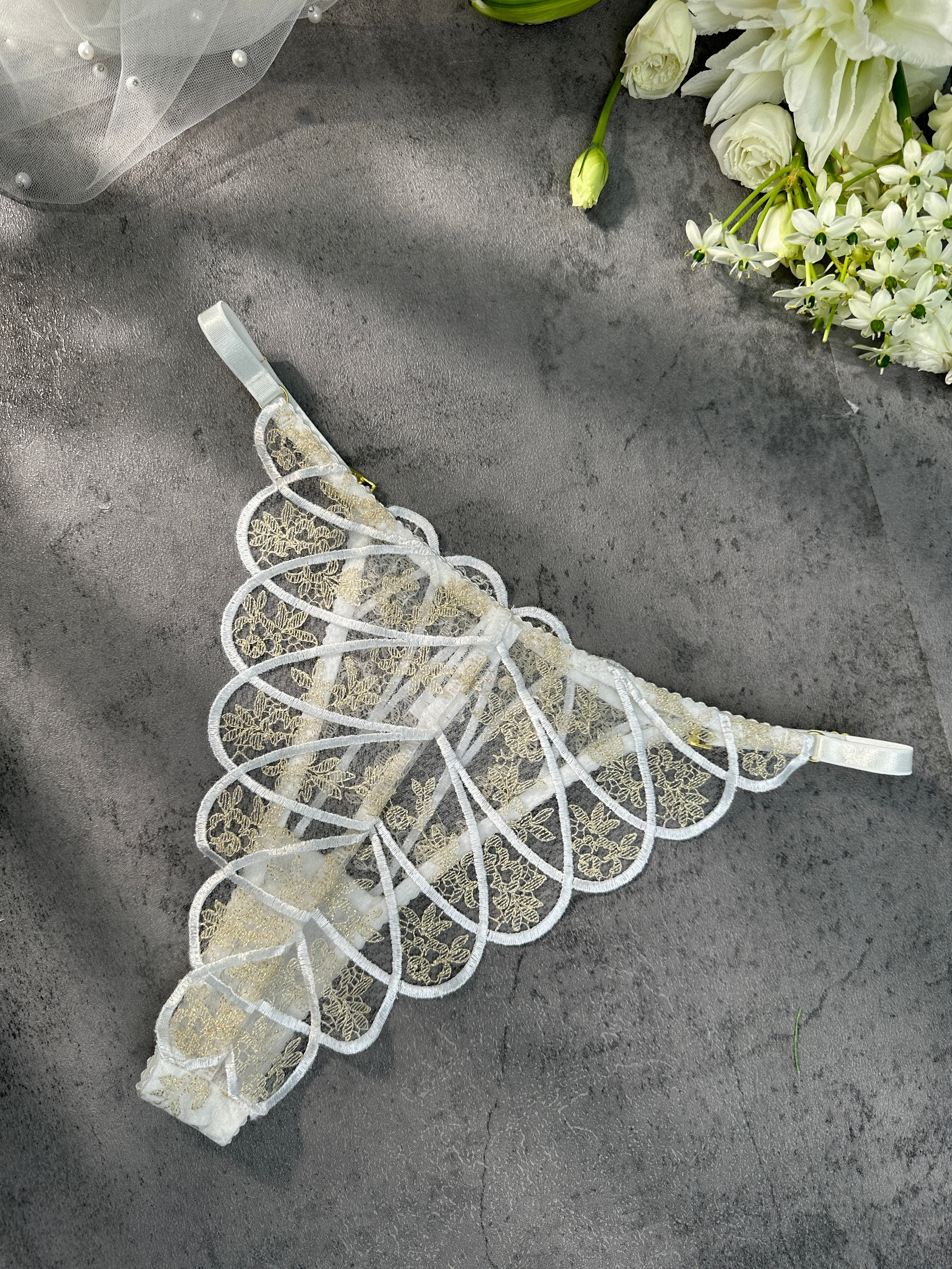 Introducing "Heavenly Glow Radiance Luxe Lingerie Set," a celestial blend of white satin and golden thread embroidery, creating an ethereal lingerie experience. Elevate your moments with the divine touch of opulence. ✨ ✨